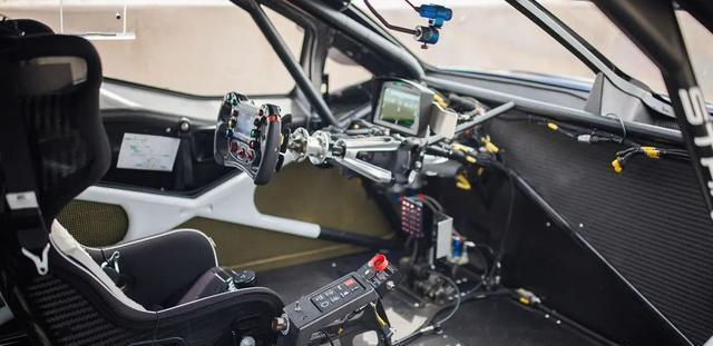 首先车辆拥有一个鹅颈式后扰流板:巨大的尾翼以鹅颈式结构从尾部向上延伸,高于驾驶室车顶,在高速下能提供稳定下压力,同时减小结构本身对气流的干扰。车头部分有一个前翼,就像一台铲雪车,将气流从车辆底部引导出去,降低升力并配合尾部扰流板形成前后空气平衡。